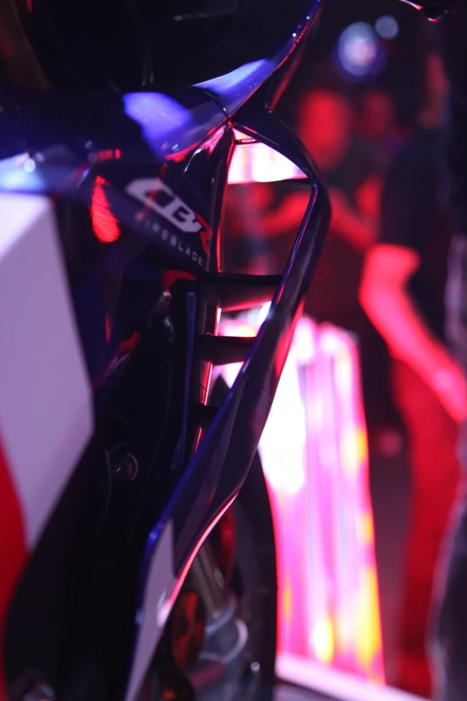 Ce moteur, dont la puissance a été portée à 217.5 cv, est directement tiré des technologies qu’Honda a mis au point sur la RC213-V de MotoGP : pistons et bielles forgés dans les mêmes matériaux que la Repsol, toutes les pièces de ce puissant cœur ont été traitées grâce à une liste de matériaux vous rappelant que vous n’êtes pas allé assez loin dans vos études de chimie. L’admission se voit greffé des conduits d’air forcé de même dimension que sur la belle du HRC profilée en soufflerie, un système inédit de distribution est monté à bord de la CBR fiabilisant de ce fait la partie haute du compte-tour, et pour ce qui est des vocalises, c’est Akrapovic qui s’est chargé de mettre en place la symphonie, alliant performance et légèreté, contribuant également à une centralisation des masses.